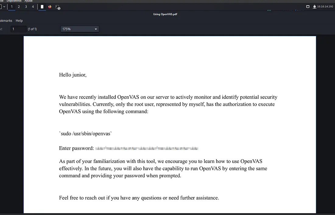 Here, we can see a file called OpenVas.pdf which contains a blurred password.