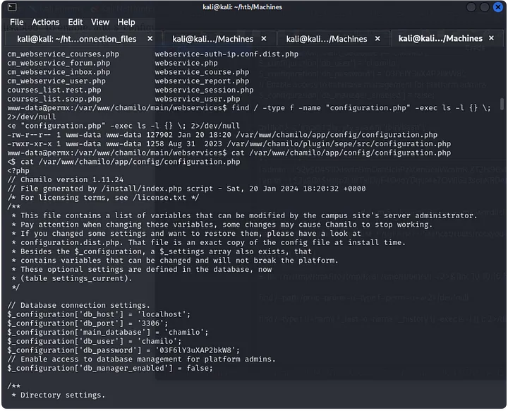 After getting a shell, we land as the user www-data and we can see that there is a user called mtz in the machine. While looking for credentials or other type of information to get to the user mtz, we find a configuration file for the database that contains the password for the user chamilo.
