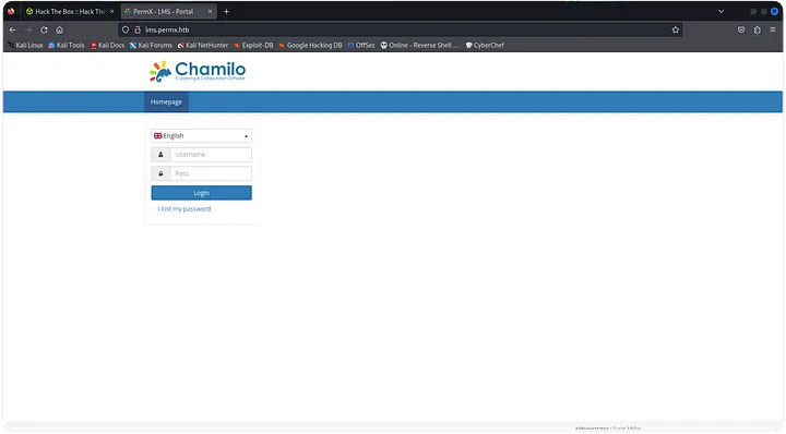 At lms.permx.htb we find a login page hosted by Chamilo LMS.