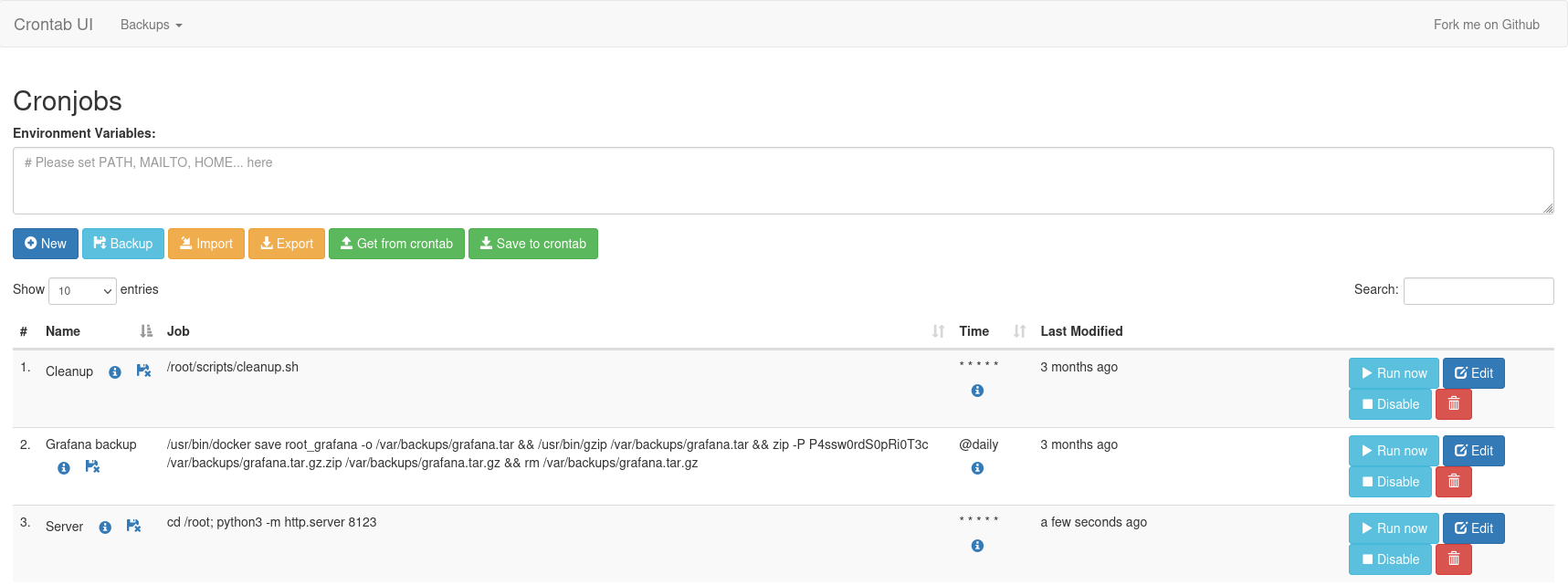 We now have access to a web interface controlling cron jobs as root. We use it to run a Python server and download the root flag.