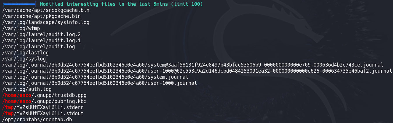 linpeas finds an interesting file: /opt/crontabs/crontab.db, recently modified. We inspect it.