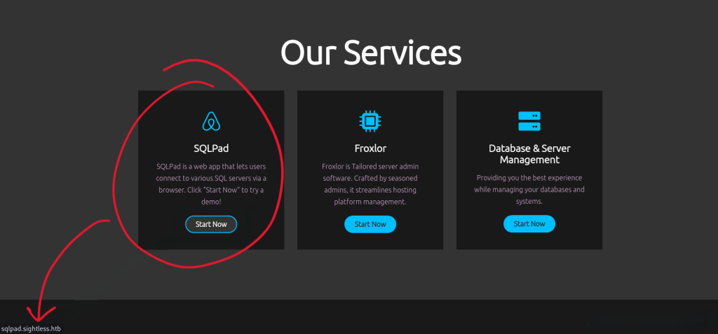 The homepage and services page of the target provide minimal information, but the SQLPad service proves crucial.