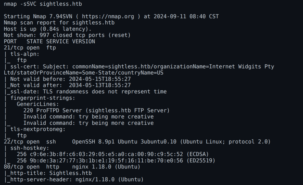 NMap scan result of sightless.htb: